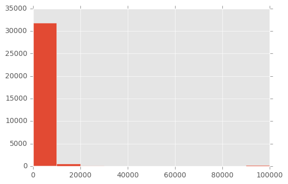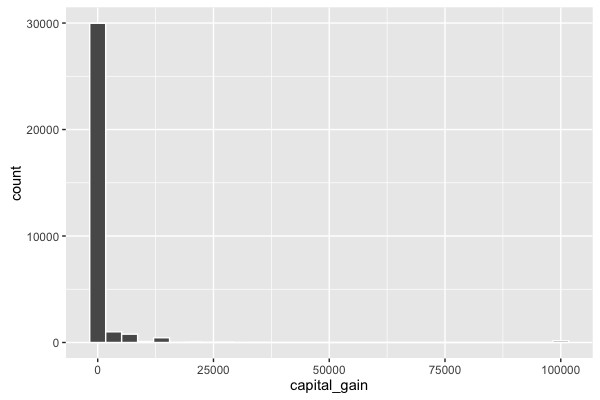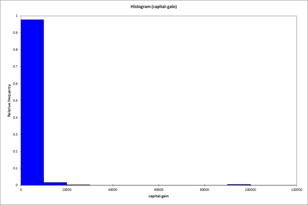 Für die Altersverteilung gibt es keine besonderen Auffälligkeiten. Offensichtlich wurden keine Kinder in den Daten berücksichtigt. Sonst entspricht die Verteilung dem was wir von einer Industrienation erwarten können. Betrachten wir nun eine weitere Variable: capital-gain. In der Beschreibung der Daten steht nur, dass es sich hier um eine stetige Variable handelt. Da der Name selbst nicht unbedingt selbst erklärend ist können wir hoffen, dass die Daten für sich selber sprechen: