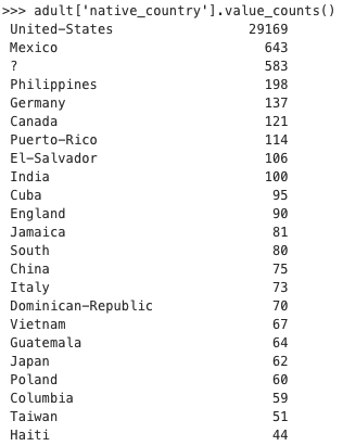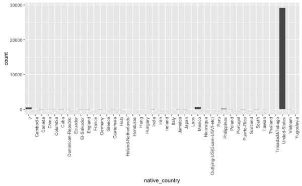 Auch hier fallen zweierlei Dinge auf: Es gibt eine Kategorie "?". Diese sollte vermutlich zu fehlenden Werten umkodiert werden. Fast alle Daten stammen aus der Kategorie "United-States". Während das erste Problem in den meisten Programmen einfach zu lösen ist, stellt Letzteres eine größere Schwierigkeit dar. Verschafft man sich einen Überblick über die konkreten Fallzahlen stellt man fest, dass für verschiedene Nationalitäten oft nur wenige Fälle im Datensatz vorkommen.