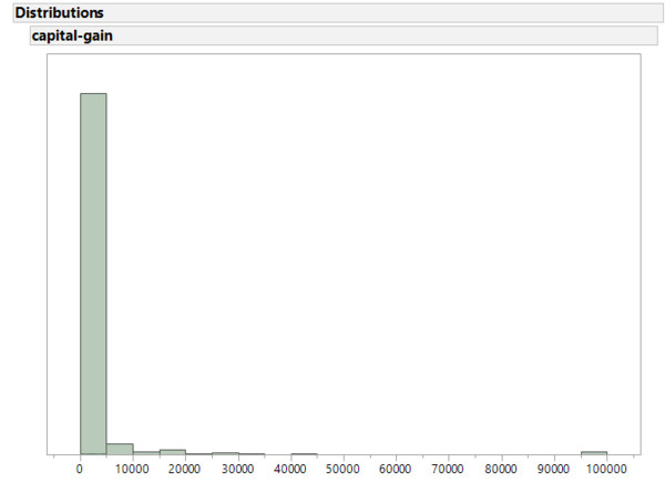 Ausserdem gab es eine Reihe von Personen, die mit 99.999 geantwortet haben. Im Histogram erscheinen diese Fälle nur als minimaler Balken. Tatsächlich sind es 159 Personen, die für capital_gain 99.999 angegeben haben. Es stellt sich hier die Frage wie die Daten erhoben wurden und ob 99.999 nicht eigentlich für eine Kategorie ">99.999" steht.