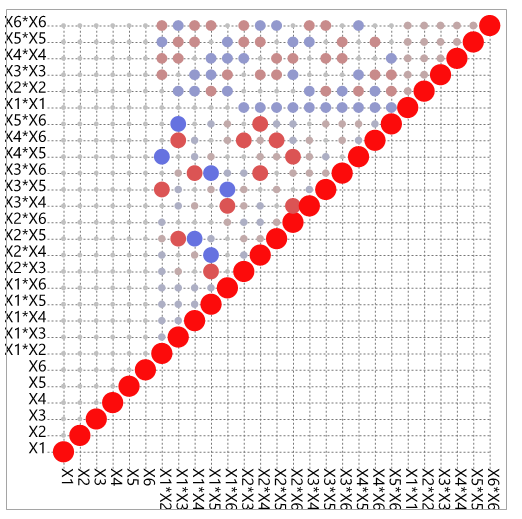 In the color matrix of the correlations one can read this property again well. The size of the circles represents the correlation between different model effects. Thus, there are some partial correlations between two-way interactions and quadratic terms. However, these are relatively small. Therefore, we should be able to make statements about main effects (ME), two-factor interactions (2FI) and quadratic effects (QE). Translated with www.DeepL.com/Translator (free version)