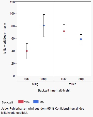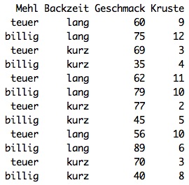 These are data from a factorial experimental design in which two different flour qualities (cheap - expensive) were processed at two baking times (short-long). All other components of the recipe (flour content, water content, baking temperature, ...) remained unchanged.