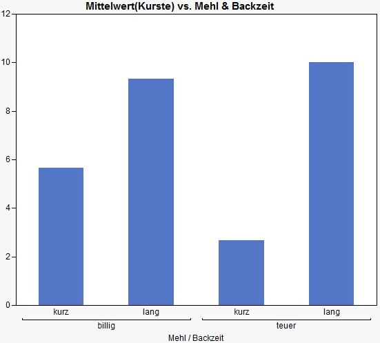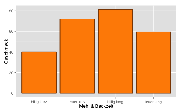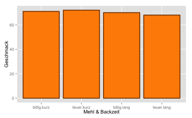 Is there a bread with a flavor score of 0? Although we have given arbitrary limits for the evaluation of the taste, no real technically, meaningful maximum or minimum for the evaluation of the taste is recognizable. So it is easily conceivable to adjust the Y-scale of the bar chart. A reasonable base could be anywhere, not necessarily at the 0th percentile.