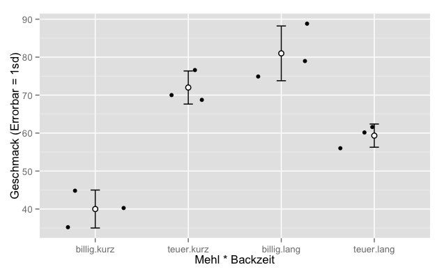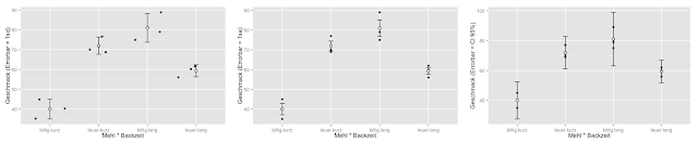 As you can see, the appearance of the graph depends dramatically on the choice of the Y-axis scale. If you take a base of 0, there seems to be no difference between the groups, if you choose a base of 67 instead, you will notice that there seems to be dramatic differences between cheap*short and cheap*long. If a graph depends so much on an arbitrary decision it cannot be suitable for an objective data analysis. Alternative: Scatter plot with error bars Unlike bar charts, scatter plots do not explicitly connect to a zero point!