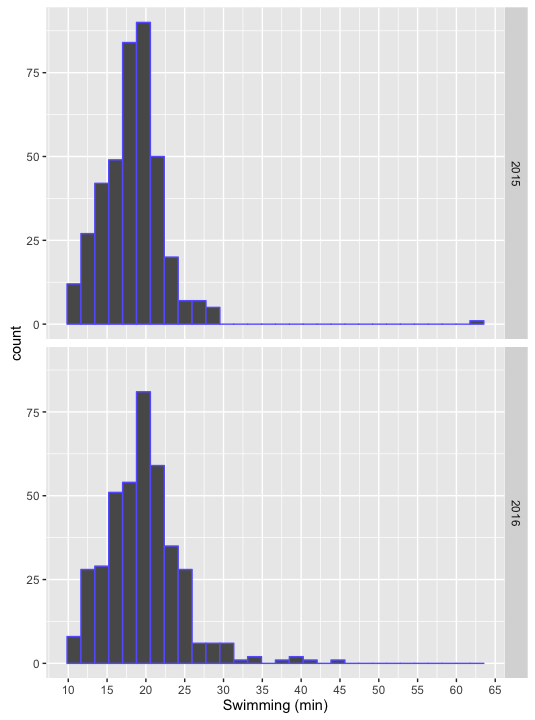 Typical swim times for this distance are in the 10 to 25 minute range. I assume that the 65 minutes from 2015 is an erroneous data point.