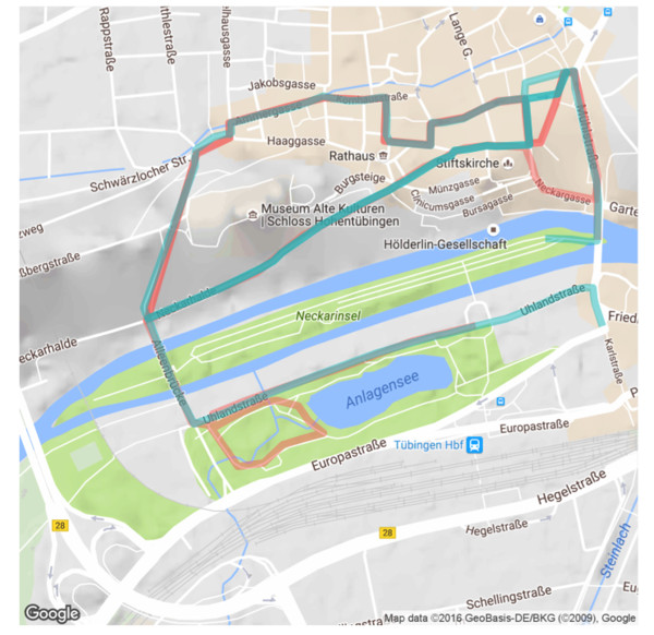 Admittedly, the two routes (2015 red, 2016 blue) look pretty much the same on the map. In 2015, however, the routing was such that you had to run the long straight parallel to the Neckar a total of 2 times. In 2016, the routing was the other way around and you ran through this section a total of three times.