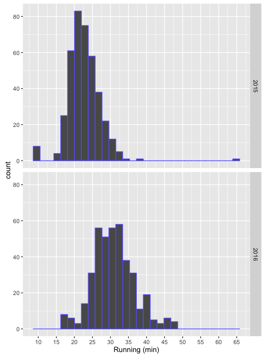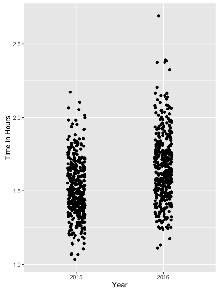 At this point, I don't need a statistical hypothesis test to see that something has changed from 2015 to 2016. Even without calculating the tests, I can promise you that both the two-sample t-test for the full sample and a paired-t-test for the connected sample would show a statistically significant difference. But while the 10-15 minute difference has practical relevance for me, possible test results here do not. I couldn't resist a bit of p-value-bashing at this point.